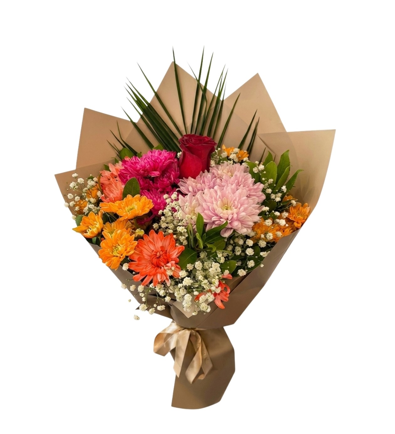 Autumn Sunset, aşkın ve tutkunun simgesi merkezdeki çarpıcı kırmızı gülün, enerjik turuncu ve zarif pembe krizantemlerle sıcak bir uyum yakaladığı özel bir tasarımdır. Zarif cipsofilya dokunuşları ve uzun yeşil yapraklarla zenginleştirilen bu canlı aranjman; doğal kahverengi kraft kağıt ambalajı ve şık dore (altın) rengi kurdelesiyle rustik aynı zamanda modern bir görünüm sunar. Sonbahar güneşinin sıcak tonlarını barındıran bu tasarım; doğum günleri, yıl dönümleri, içten bir teşekkür veya sevdiklerinizin gününü renklendirmek istediğiniz her an için samimi bir alternatiftir. Canlı renklerin enerjisi ve doğal ambalajın zarifliğiyle sevdiklerinize unutulmaz ve sıcak bir tebessüm armağan edin.