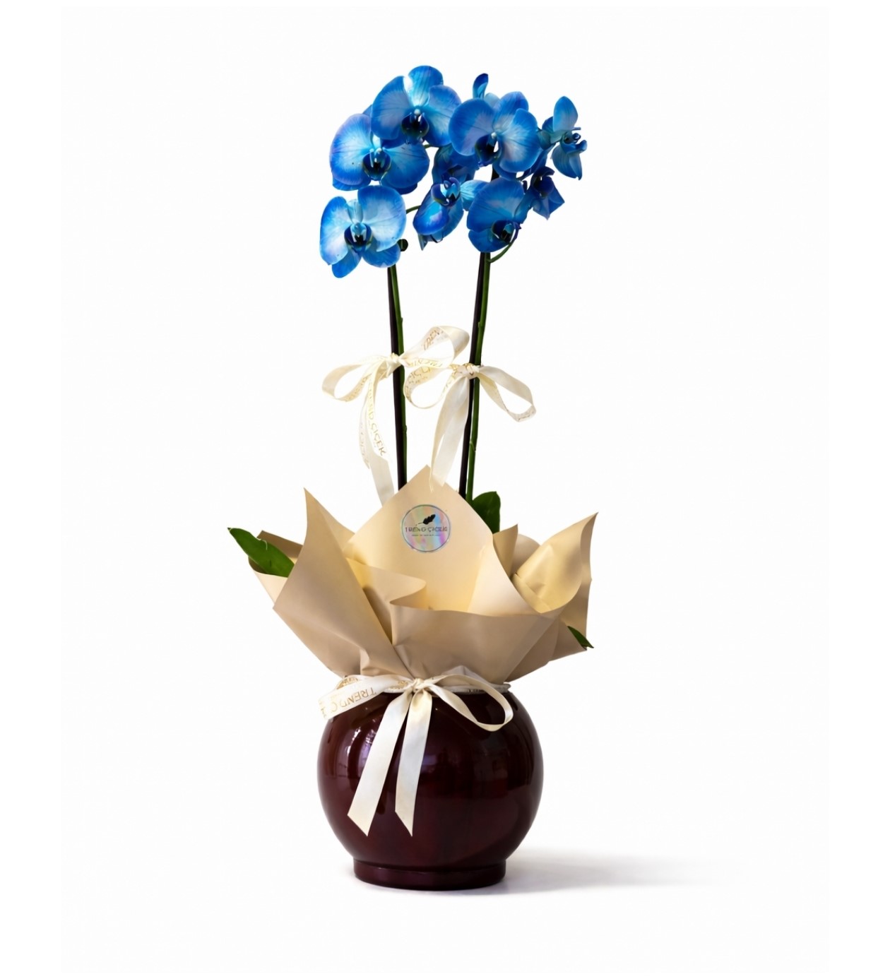 Azure Elegance, dikkat çekici ve modern görünümüyle öne çıkan 2 dal mavi phalaenopsis orkide tasarımıdır. Canlı mavi tonlarıyla hazırlanan bu özel aranjman, zarif ambalaj detayları ve şık dekoratif vazo ile tamamlanarak estetik bir görünüm sunar.