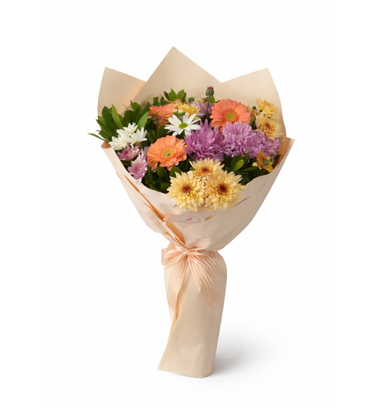 Bahar Esintisi, taze mevsim çiçeklerinin doğal uyumuyla hazırlanan zarif ve enerjik bir buket tasarımıdır. Turuncu gerberalar, mor ve beyaz krizantemler, papatya formundaki mevsim çiçekleri ve sarı tonlu çiçekler doğal yeşilliklerle bir araya getirilerek canlı ve dengeli bir kompozisyon oluşturur. Krem tonlarında modern ambalaj ve zarif kurdele detayı bukete sade ama şık bir görünüm kazandırır.