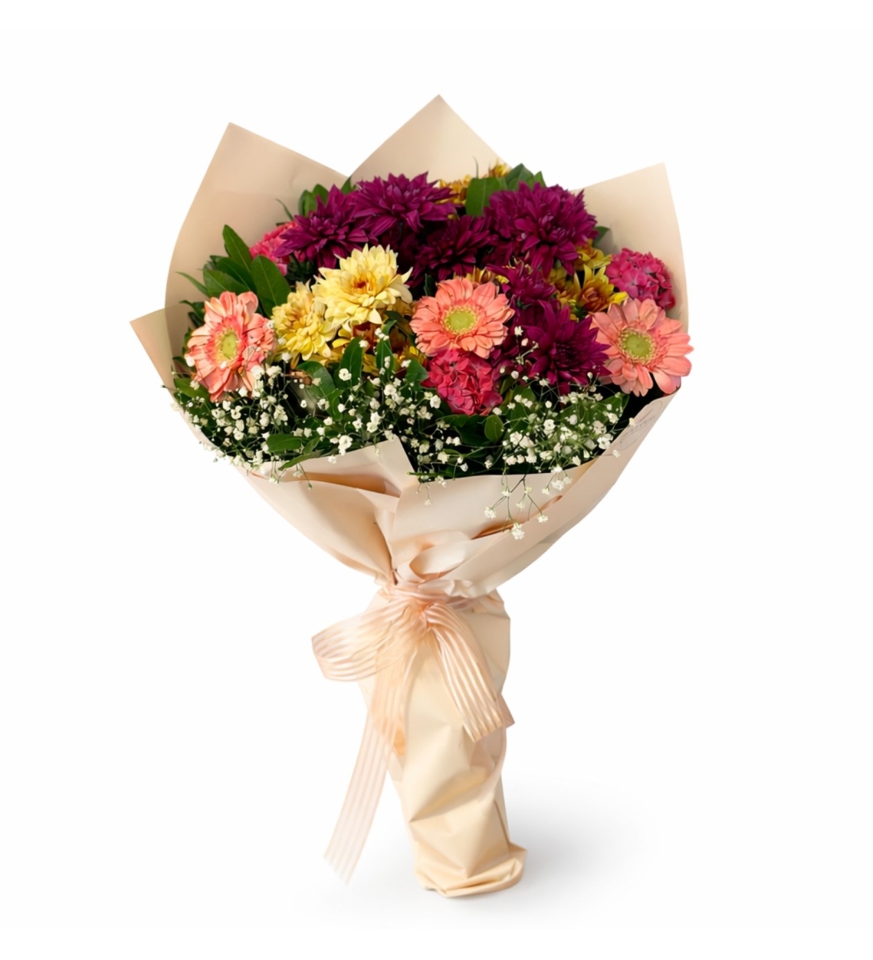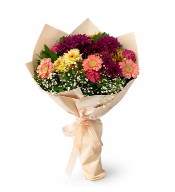 Bahar Neşesi, canlı renkleri ve taze mevsim çiçeklerinin uyumuyla hazırlanan zarif bir buket tasarımıdır. Pembe gerberalar, sarı ve bordo tonlarındaki krizantemler ile doğal yeşilliklerin bir araya gelmesiyle oluşturulan bu buket, enerjik ve sıcak bir görünüm sunar. Özenle seçilen çiçekler krem tonlarında şık bir ambalaj ile sarılarak estetik bir sunum haline getirilmiştir.