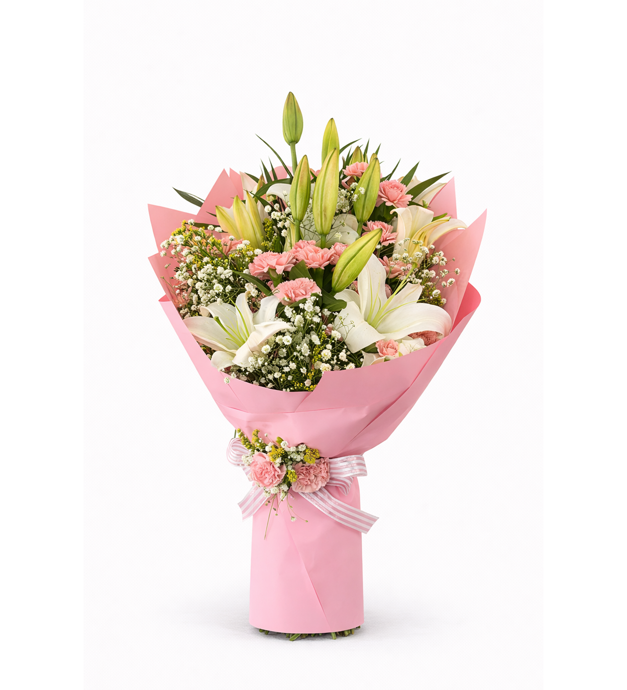 Blush Elegance – Lilyum & Karışık Çiçek Buketi | Premium Collection, beyaz lilyumların zarafeti ile pastel pembe tonlardaki mini karanfillerin yumuşak uyumundan oluşan, şık ve romantik bir premium bukettir. Dolgun yapısı ve dengeli renk geçişleri sayesinde bulunduğu ortamda sofistike bir etki yaratır.