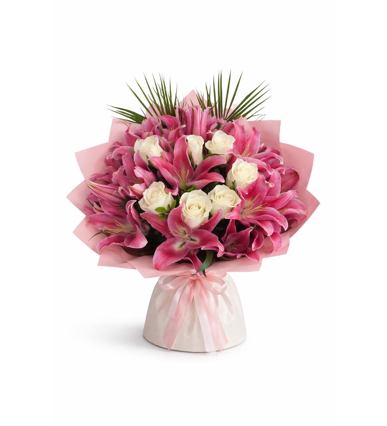 Blush Harmony, pembe lilyumların göz alıcı zarafeti ile beyaz güllerin saf ve asil duruşunu bir araya getiren, dolgun ve etkileyici bir premium bukettir. Yumuşak pembe tonlar ile beyazın uyumu sayesinde hem romantik hem de modern bir görünüm sunar.