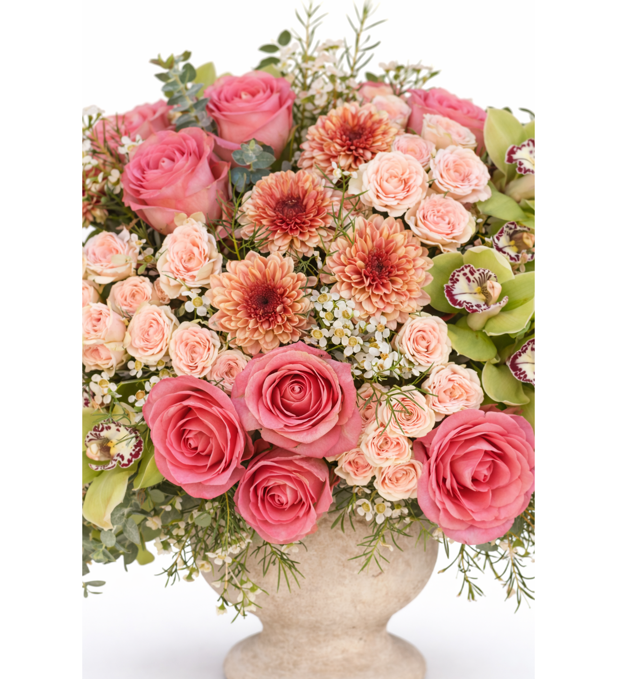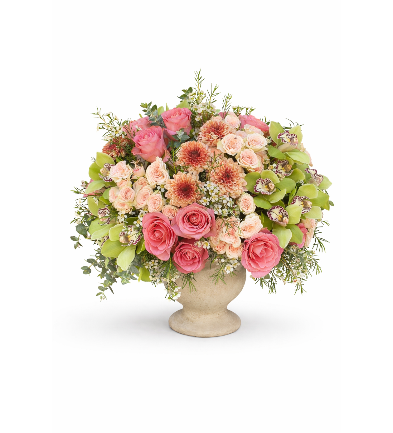 Blush Symphony, romantizmin simgesi canlı pembe güller, egzotik yeşil cymbidium orkideler ve şeftali tonlarındaki taze mevsim çiçeklerinin kusursuz bir uyumla harmanlandığı exclusive bir aranjmandır. Klasik tarzda, eskitme taş görünümlü zarif bir vazo içerisinde sunulan bu tasarım; doğanın en güzel pastel tonlarını lüks ve nostaljik bir dokunuşla bir araya getiriyor. Doğum günleri, yeni iş tebrikleri, anneler günü veya sevdiklerinize zarif bir jest yapmak istediğiniz her an için mükemmel bir alternatiftir. Yeşilin ferahlığı ve pembenin huzur veren estetiği ile bulunduğu ortama zarafet katar. İnce zevklere hitap eden, sıradanlıktan uzak ve kalıcı bir izlenim bırakmak isteyenler için prestijli bir seçimdir.