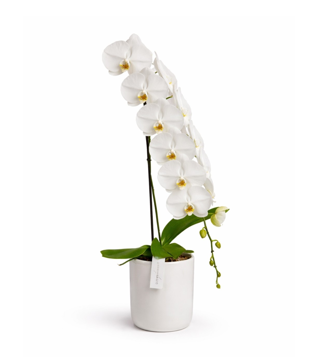 Formidablo White, zarafeti ve sadeliği bir araya getiren premium beyaz Phalaenopsis orkide tasarımıdır. Uzun ve gösterişli çiçek sapı üzerinde sıralanan iri beyaz çiçekler, bulunduğu ortama sofistike bir atmosfer kazandırır.