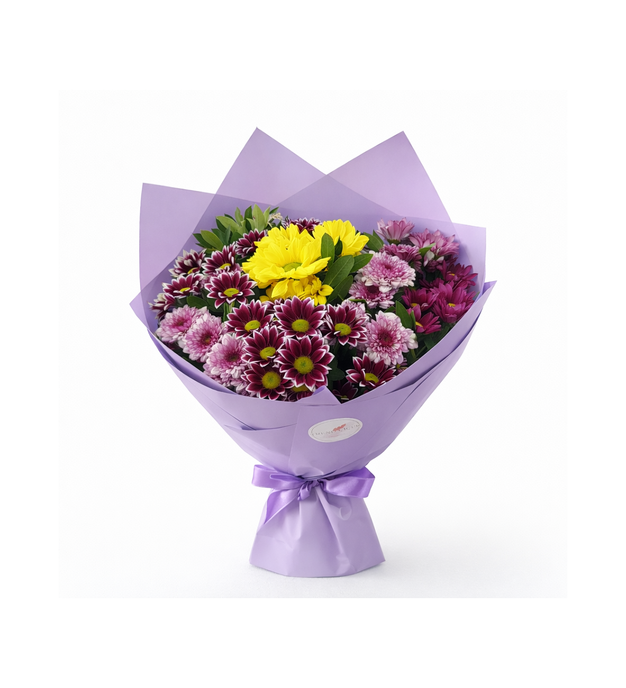 Lavender Harmony, enerjiyi simgeleyen canlı sarı krizantemler ile bordo, mürdüm ve pastel pembe tonlarındaki zarif krizantemlerin kusursuz uyumuyla tasarlanmış premium bir bukettir. Simetrik ve dolgun formda hazırlanan bu özel tasarım, lila tonlarında modern ambalajı ve zarif kurdele detayıyla hem şık hem de göz alıcı bir sunum sunar.