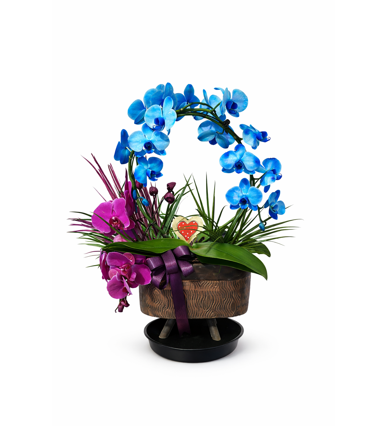 Bu özel tasarım aranjman; göz alıcı mavi orkide ve sol tarafta yer alan mor kesme orkide çiçeklerinin şık uyumuyla hazırlanmıştır. Modern ve zarif görünümü sayesinde doğum günü, yıldönümü, tebrik ya da özel günler için etkileyici bir hediye alternatifidir.