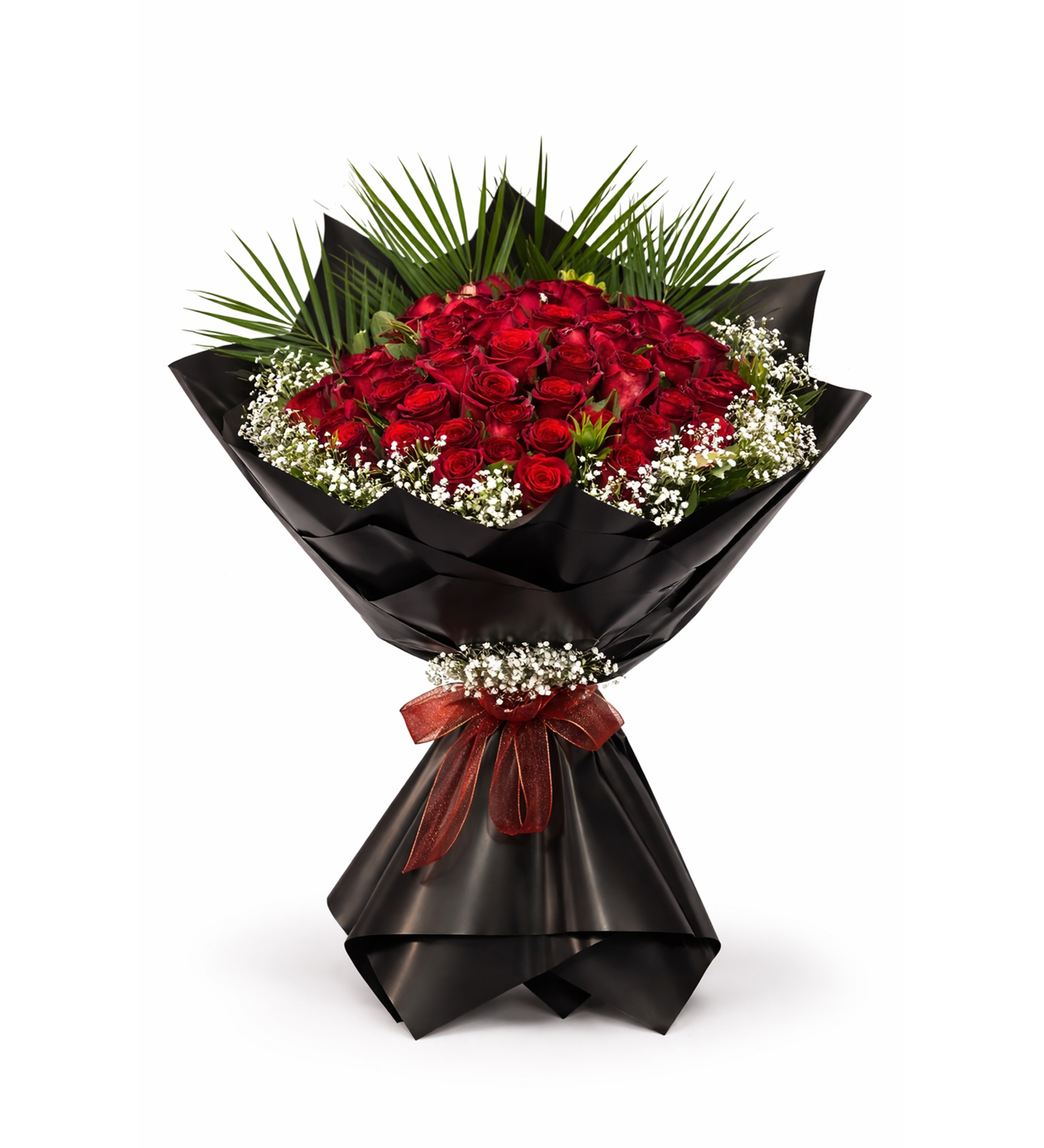 Cipso detayları ve yeşil yaprak dokunuşları, kırmızının dramatik enerjisini dengelerken; siyah ambalaj tasarımı aranjmana sofistike ve lüks bir karakter kazandırır. Yıldönümü, Sevgililer Günü, özel kutlamalar veya unutulmaz bir romantik sürpriz için iddialı bir tercihtir.