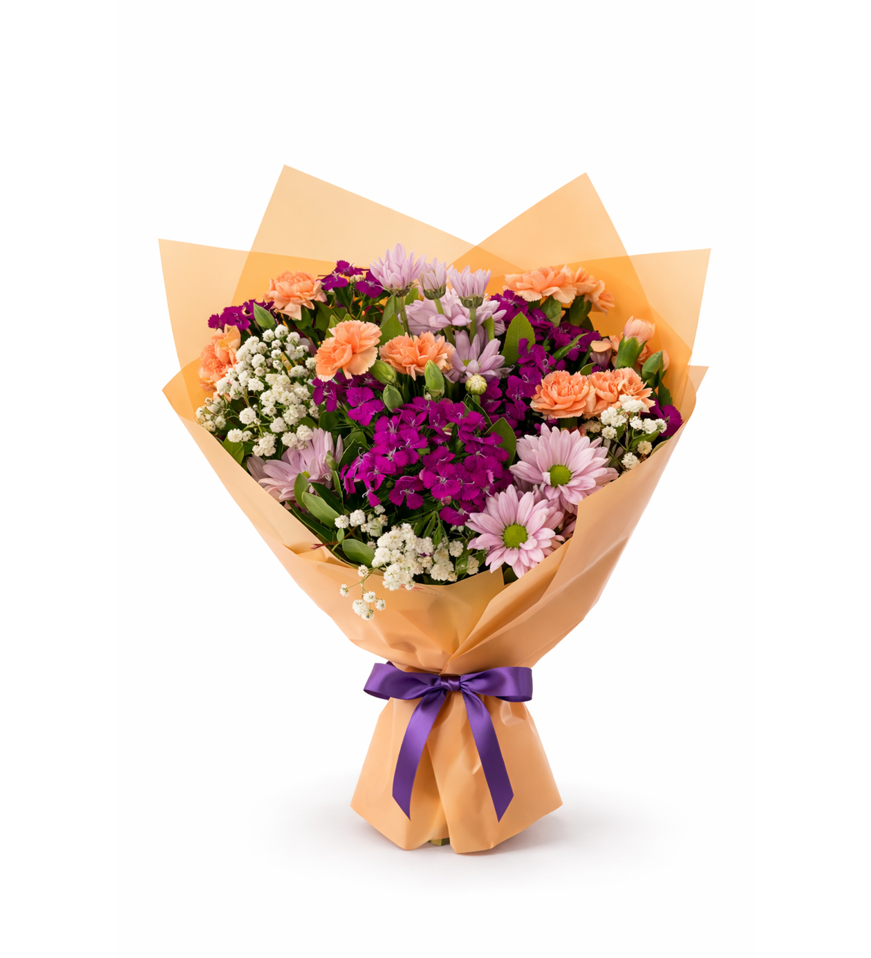 Pastel Charm, şeftali tonlarında zarif karanfiller, lila papatyalar, canlı fuşya dianthus çiçekleri ve romantik cipso dokunuşlarının uyumlu birlikteliğiyle tasarlanmış enerjik bir bukettir. Renk geçişleri sayesinde hem yumuşak hem de dikkat çekici bir görünüm sunar.