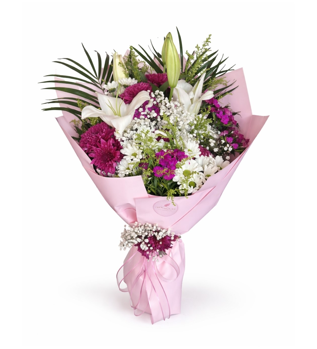 Pink Harmony, zarif beyaz lilyumların asil duruşu, canlı pembe kasım patı ve hüsnüyusufun enerjik tonları ile beyaz papatyaların ferah görünümünü bir araya getiren özel tasarım bir bukettir. Renk geçişleri sayesinde hem romantik hem de dinamik bir kompozisyon sunar.