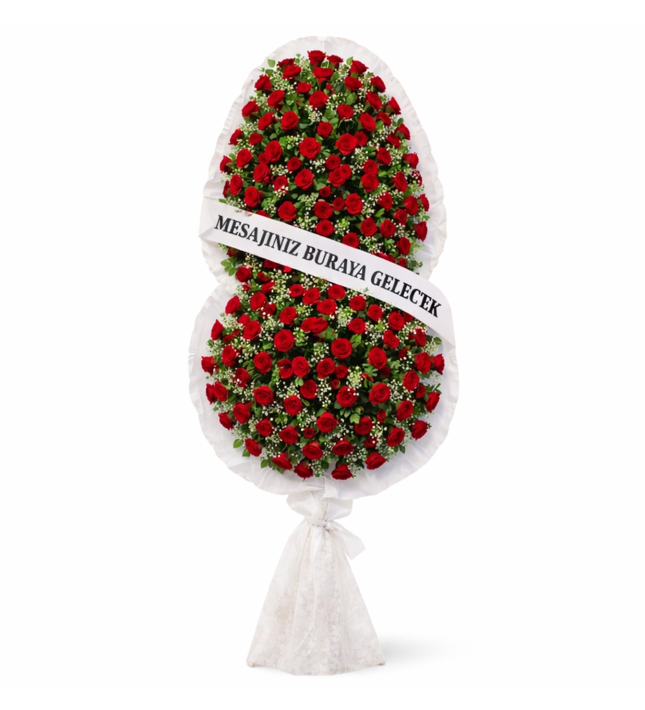 Tamamı taze ve canlı kırmızı güllerle hazırlanan 2 katlı premium çelenk modeli, gösterişli ve etkileyici tasarımıyla özel günlerde güçlü bir duruş sergiler.