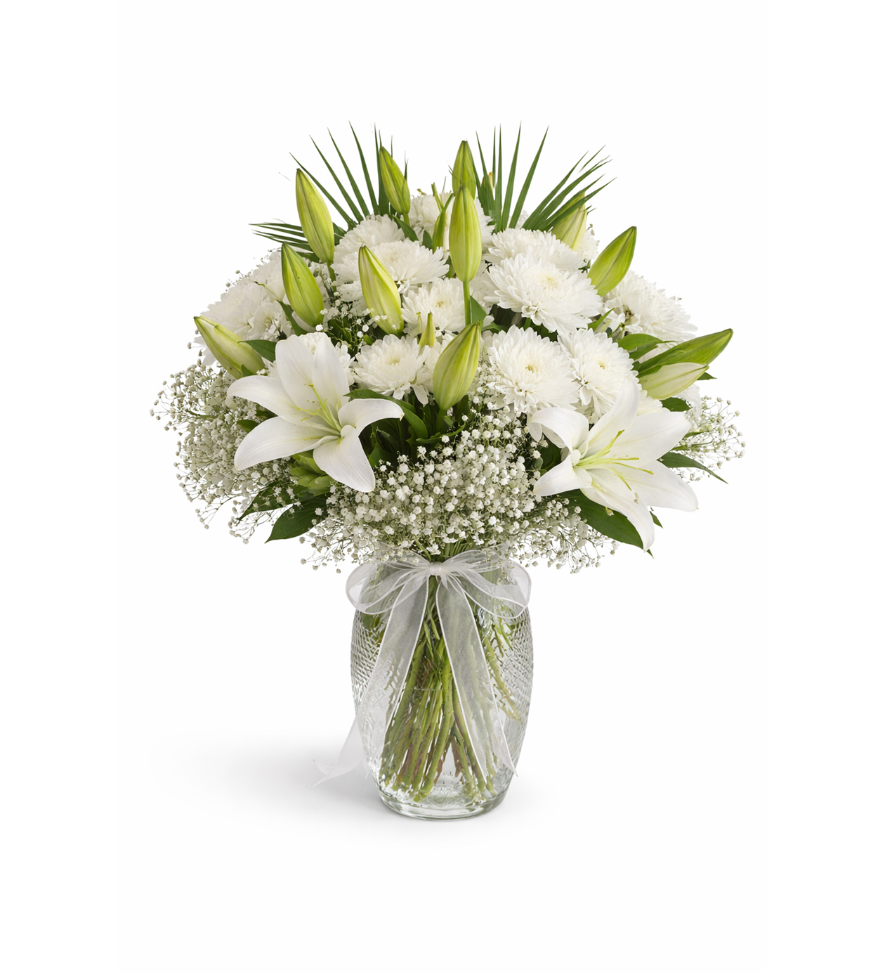 Zarafetin ve saflığın simgesi beyaz lilyumlar, anastasia çiçeklerinin dolgun dokusu ile birleşerek ferah ve şık bir aranjman oluşturur. Özel kesme cam vazo içerisinde hazırlanan bu aranjman; ev, ofis ve özel günler için modern ve prestijli bir hediye alternatifidir.