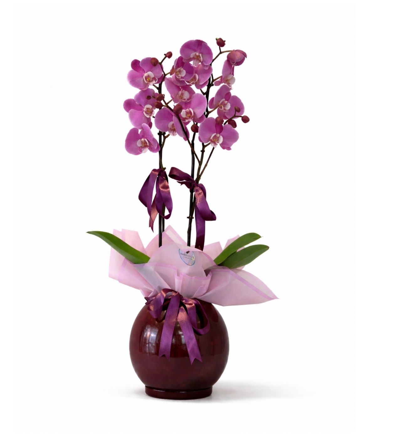 Pastel tonlardaki dekoratif ambalaj ve zarif kurdele detayları, orkidenin doğal güzelliğini ön plana çıkararak tasarıma sofistike bir dokunuş kazandırır. Mor orkidenin asil ve etkileyici görünümü bulunduğu ortama prestijli ve modern bir atmosfer katar.