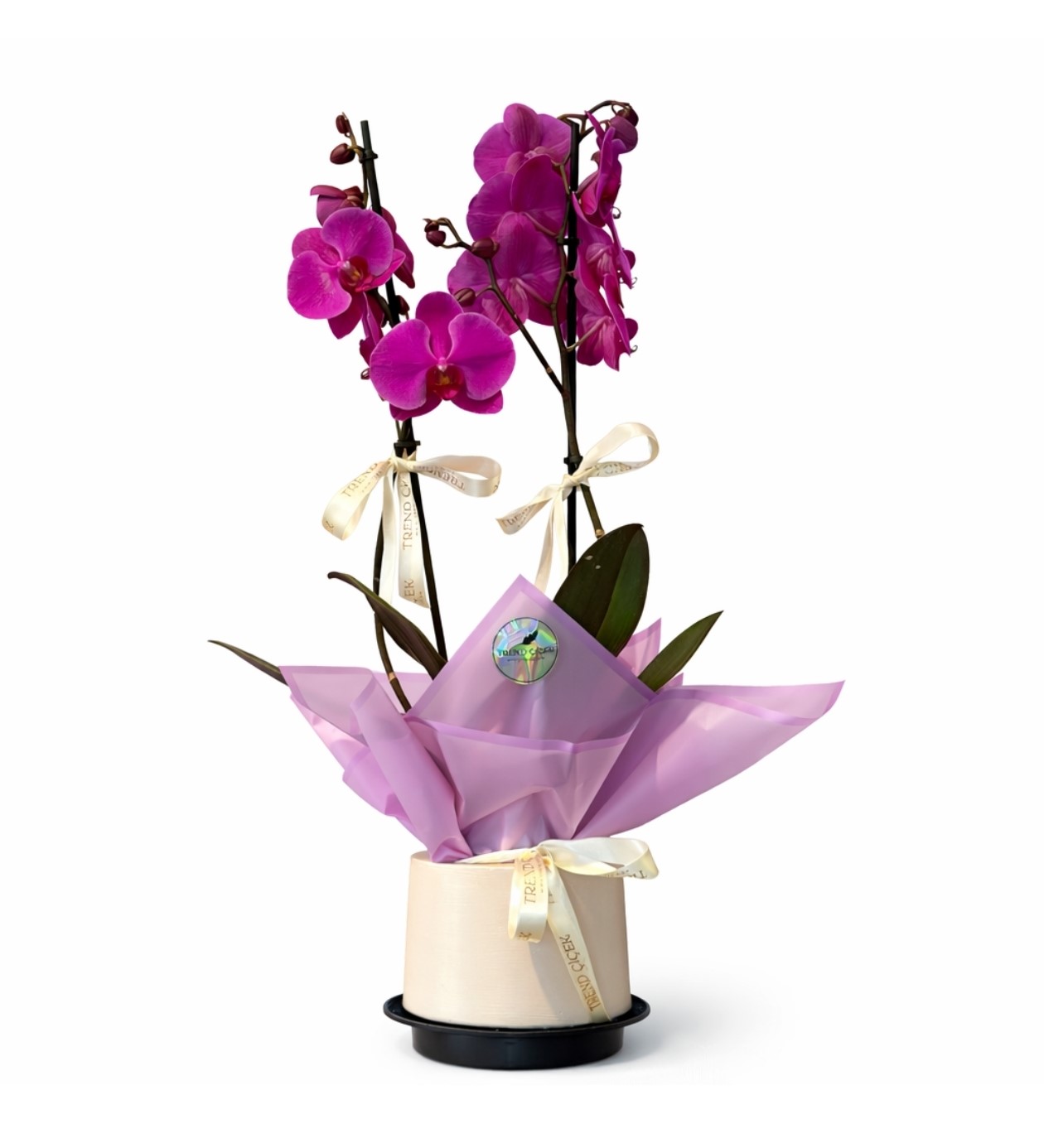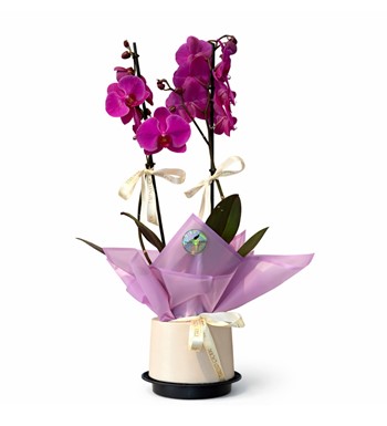 Royal Fuchsia, göz alıcı fuşya tonlarındaki çift dallı phalaenopsis orkidenin modern ve zarif bir sunumla bir araya getirildiği premium bir tasarımdır. Uzun ve güçlü orkide dalları üzerinde açan canlı çiçekler, minimal krem tonlarında şık bir saksı ve pastel ambalaj detaylarıyla tamamlanarak sofistike bir görünüm sunar.