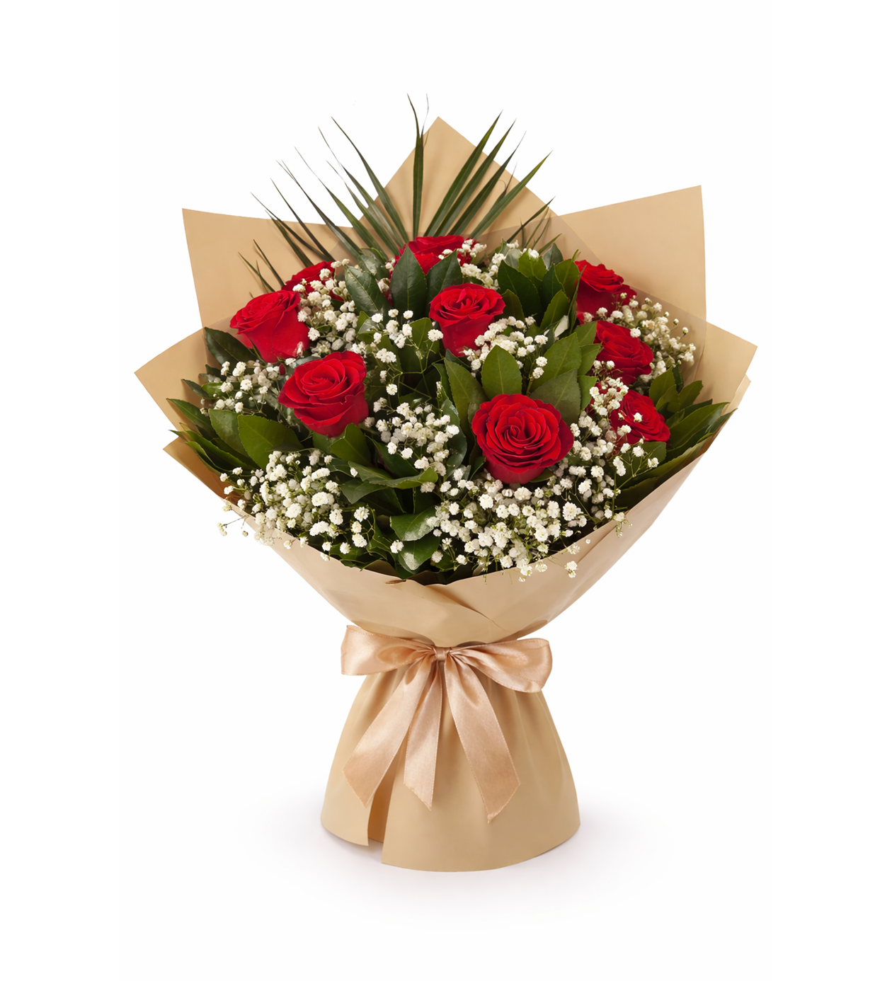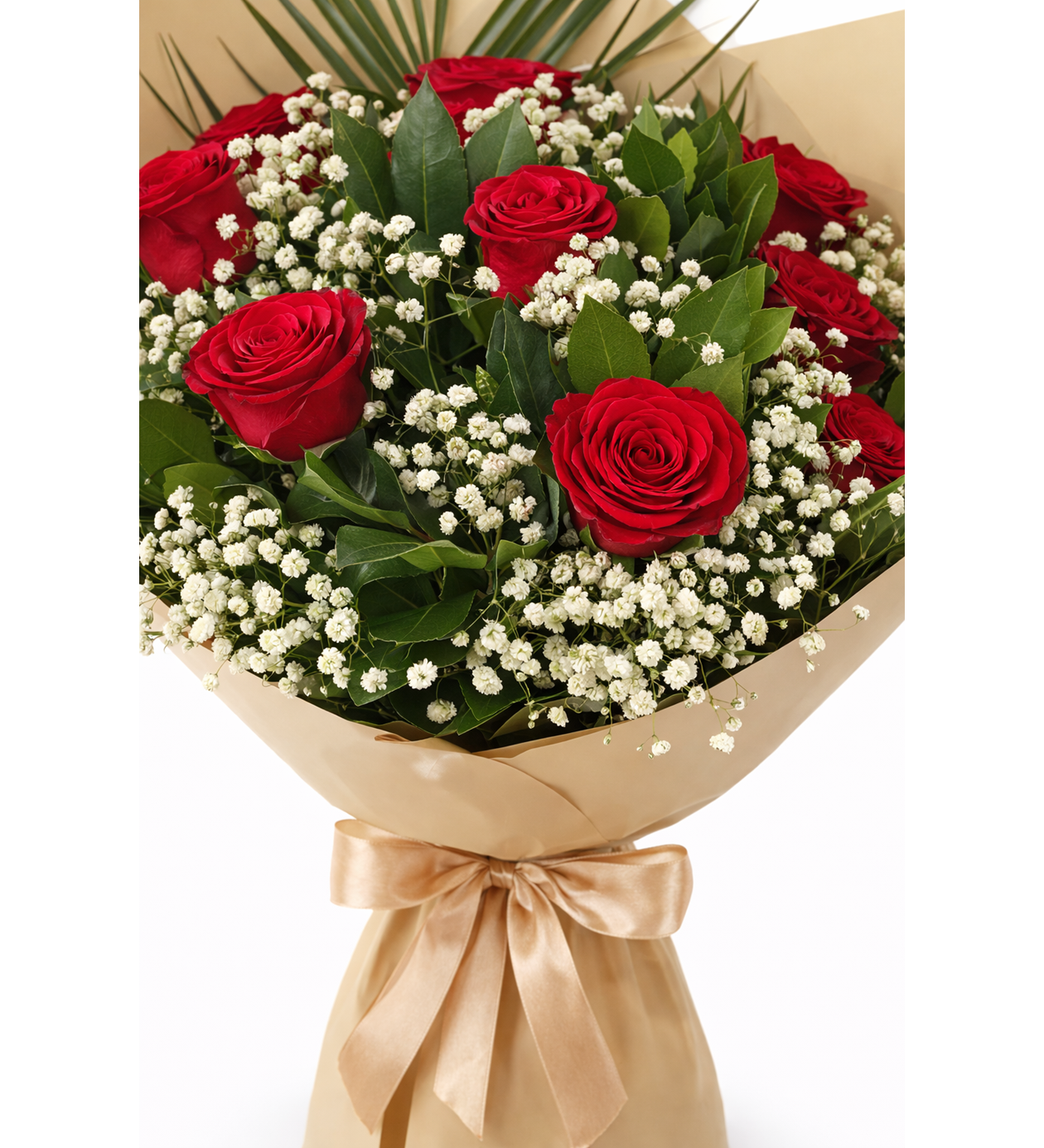 Royal Passion, aşkın ve tutkunun simgesi olan canlı kırmızı güllerin, zarif beyaz cipso çiçekleri ve yoğun yeşil yaprak dokusuyla harmanlandığı premium bir buket tasarımıdır. Simetrik ve dolgun formda hazırlanan aranjman, modern bej ambalaj ve saten kurdele detayıyla şık bir sunum kazanır.