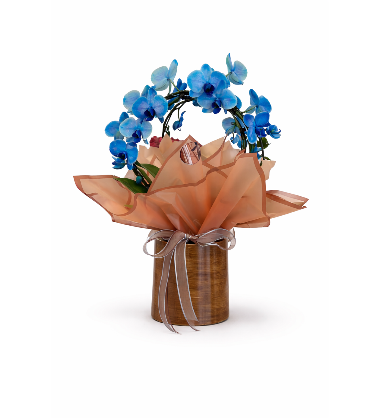 Sapphire Circle, özel çember formda şekillendirilmiş göz alıcı mavi Phalaenopsis orkidenin modern ve zarif tasarımıdır. Canlı mavi tonları, orkidenin klasik zarafetini çağdaş bir form ile buluşturarak etkileyici bir görünüm sunar.