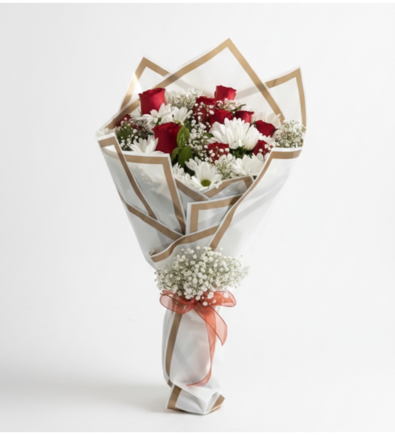 Scarlet Daisy, aşkın en güçlü ifadesi olan 10 adet kırmızı gülün, masumiyetin simgesi beyaz papatyalar ve zarif cipsofilya dokunuşlarıyla buluştuğu özel bir tasarımdır. Kırmızı ve beyazın çarpıcı kontrastı, şık ambalaj tasarımı ve zarif kurdele detayı ile modern ve etkileyici bir görünüm sunar.