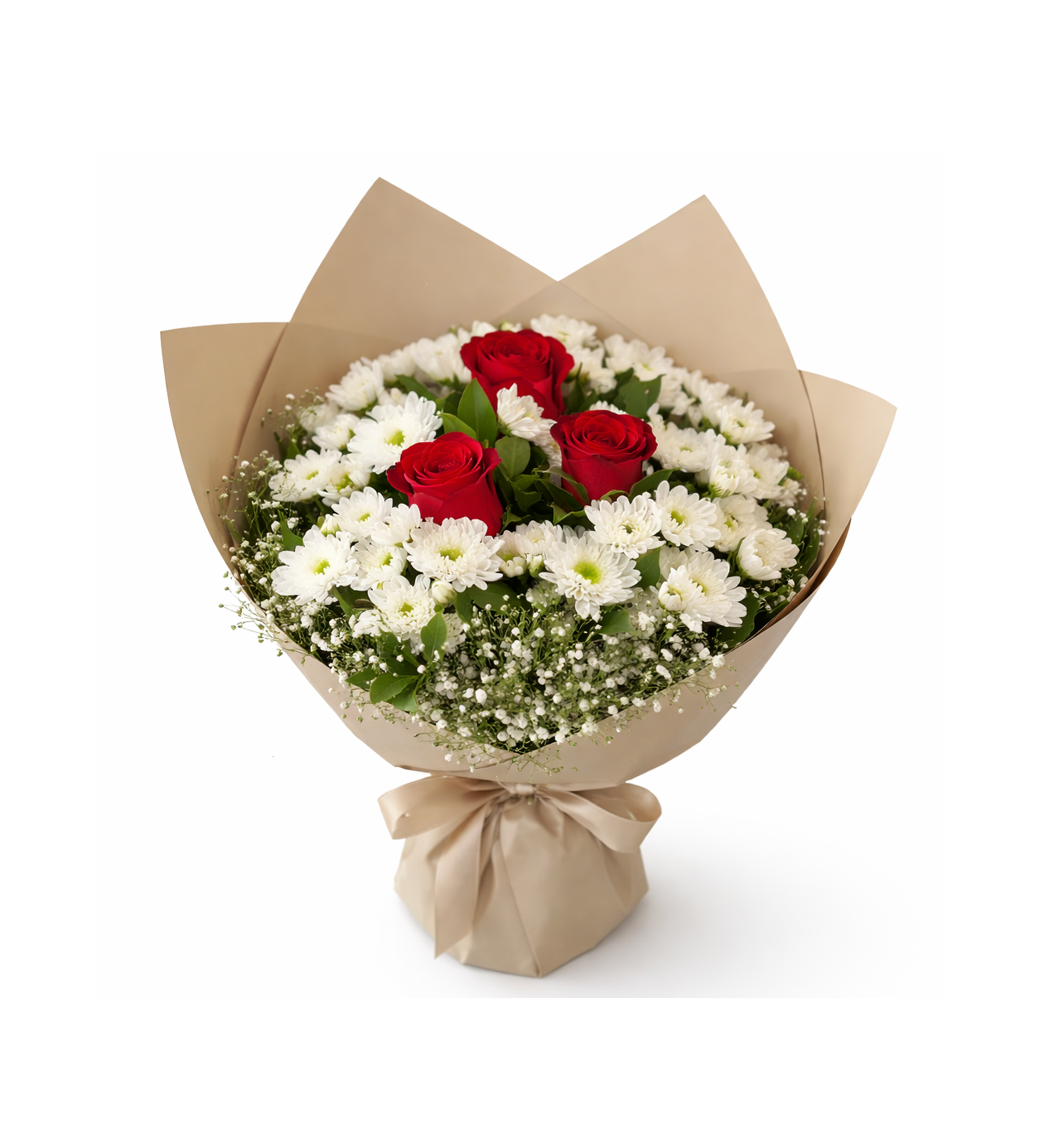 Scarlet Trio, aşkın en güçlü ifadesi olan üç adet canlı kırmızı gülün; taptaze beyaz papatyalar ve zarif cipso çiçekleriyle hacimli ve dengeli bir formda bir araya geldiği özel bir bukettir. Modern ve sade kraft ambalajı içerisinde sunulan bu tasarım, kırmızının tutkusunu beyazın saf zarafetiyle buluşturur.