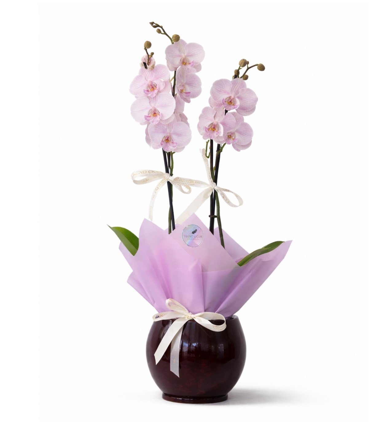 Soft Blush, zarif ve romantik tonlarıyla dikkat çeken açık pembe phalaenopsis orkide çiçeklerinden oluşan premium bir aranjmandır. İki dal orkidenin dengeli ve estetik formu, pastel tonlardaki şık ambalaj ve zarif kurdele detaylarıyla tamamlanarak modern bir çiçek tasarımı ortaya çıkarır.