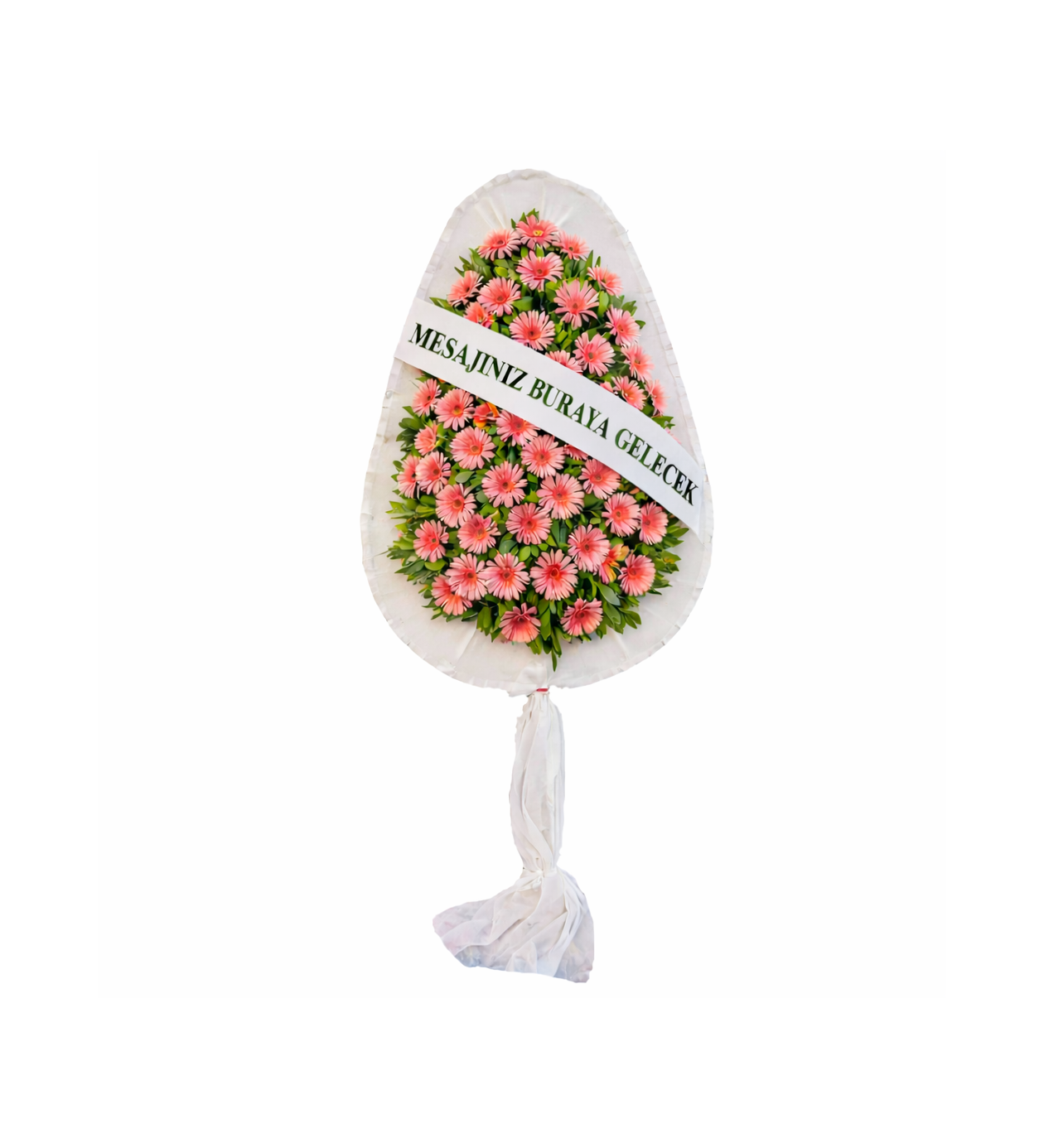 Pink Elegance, canlı pembe gerberaların enerjik görünümü ve yoğun yeşil dolgu yapraklarının doğal uyumuyla tasarlanmış şık bir açılış çelengidir. Damla form tasarımı sayesinde hem modern hem de zarif bir siluet sunar.