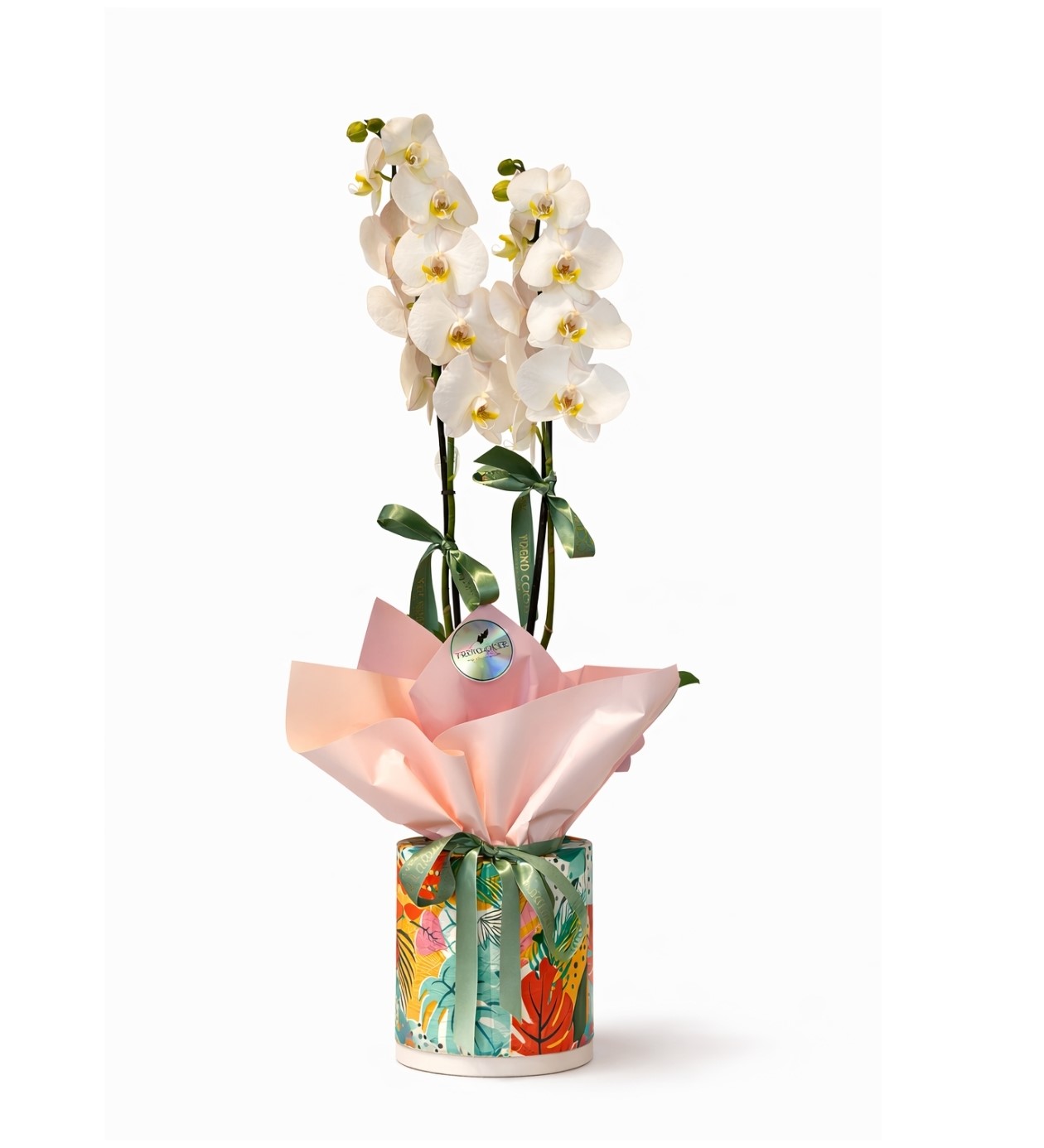 Tropikal desenli özel tasarım saksı, pastel tonlardaki zarif ambalaj ve yeşil kurdele detaylarıyla tamamlanan bu aranjman; modern dekorasyon anlayışı ile doğanın canlı enerjisini bir araya getirir. Minimal ama dikkat çekici görünümü sayesinde hem ev hem ofis ortamlarında estetik bir atmosfer oluşturur.