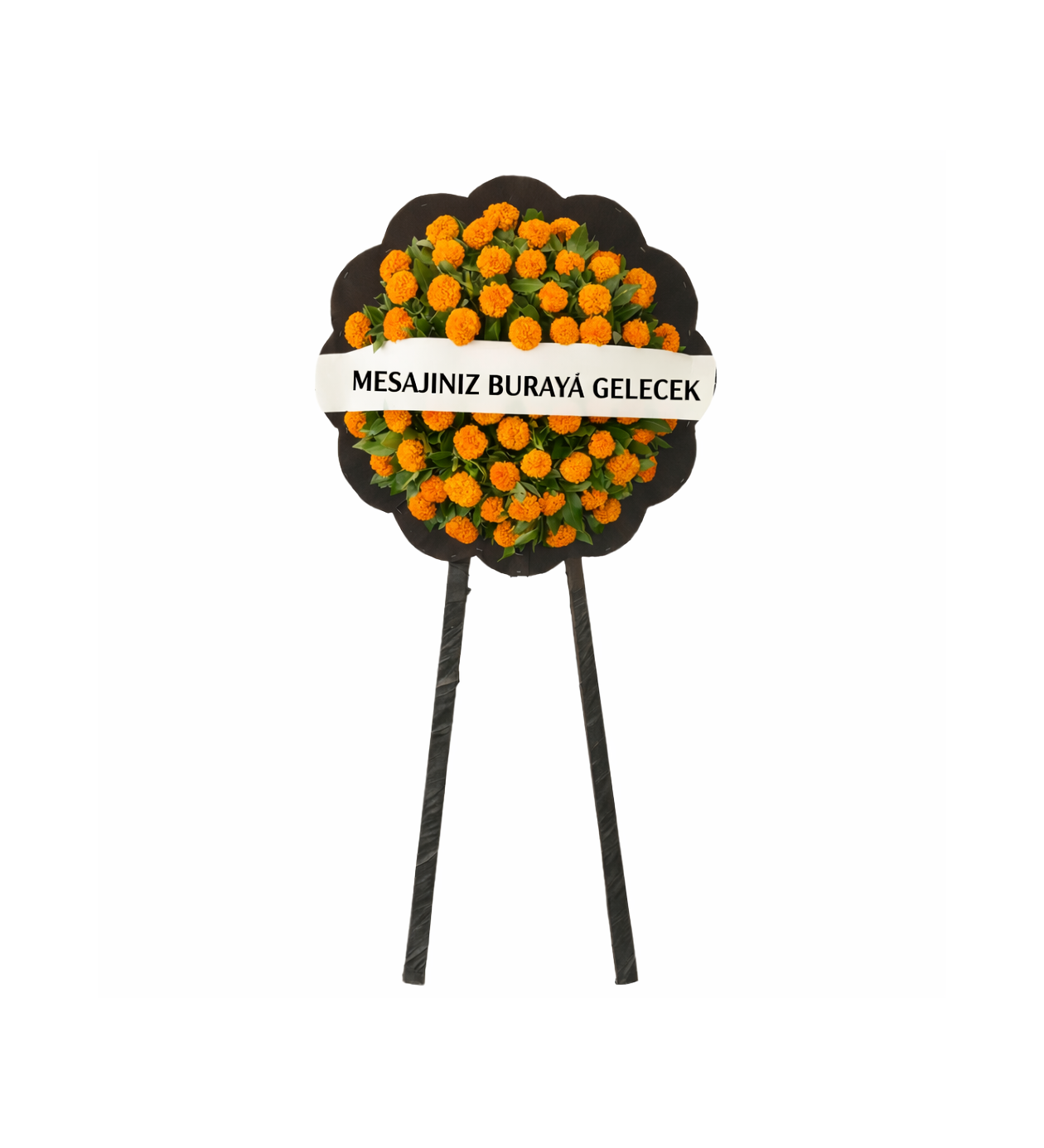 Yaklaşık 200 cm yüksekliğe sahip olan bu model, cenaze törenleri, anma organizasyonları ve resmi taziye ziyaretleri için uygun bir tercihtir. Turuncu çiçeklerin sıcak ve dikkat çekici tonu, siyah zemin ile birlikte hem asil hem de saygılı bir duruş sergiler.
