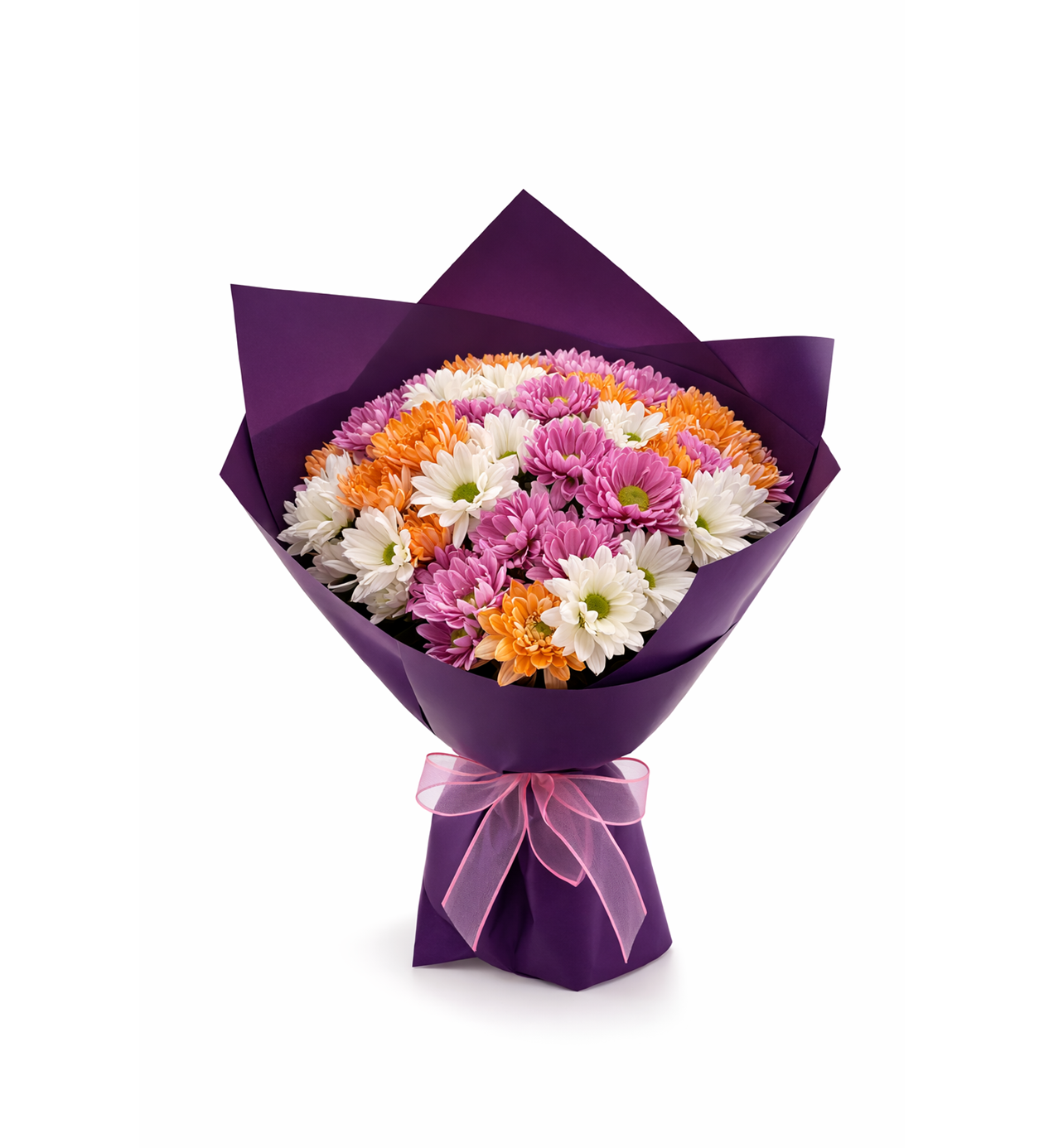 Violet Harmony, canlı pembe, saf beyaz ve enerjik turuncu papatyaların simetrik ve dolgun bir formda bir araya getirildiği premium bir buket tasarımıdır. Özenle seçilmiş taze çiçekler, modern ve şık mor ambalaj içerisinde zarif bir pembe kurdele detayıyla sunularak güçlü bir görsel etki yaratır.